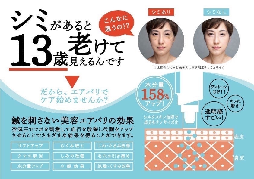 空気圧でツボを刺激するので痛みも無く安全です。 針を刺さない美容「エアバリ」は、空気圧でツボを刺激するので痛みもなく、ダウンタイムもありません!直後からメイクもOK。ツボを刺激しながら美容液の栄養素を細かい粒子に分解し、皮膚の深い層まで届けて、肌にうるおいを与えます。 代謝を上げて、血行を改善することで、リフトアップ・むくみ取り・シワ改善・毛穴の引き締めにも効果的!!